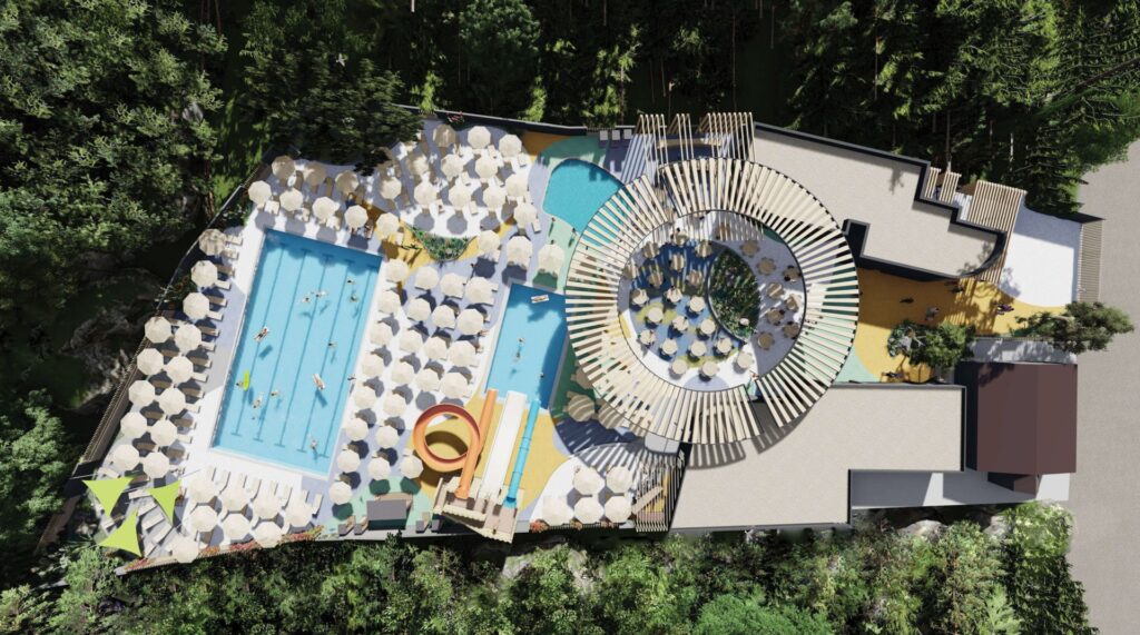 Spoljni deo kompleksa činiće otvoreni olimpijski bazen sa plažom i mestom za spasioca, ali i dečji bazen. Njima će se pristupati preko ulaznog platoa i svlačionica unutar objekta preko dezinfekcionih barijera. U zaleđu duže strane bazena su planirane tribine.